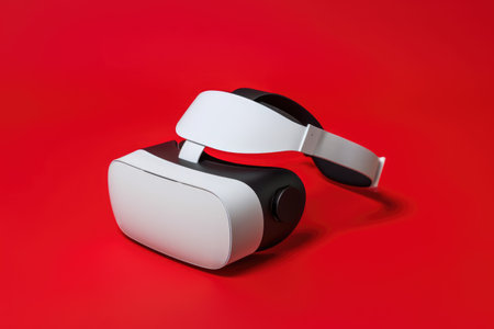 White vr headset on red background with copy space, created using generative ai technology. Virtual reality and digital interface technology concept digitally generated image.