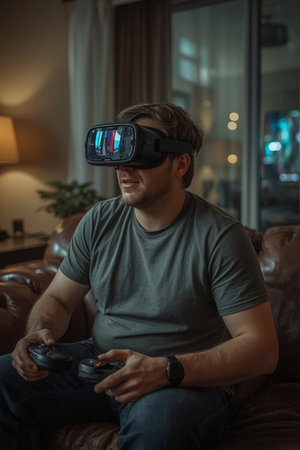A living room scene with a gamer in gray t-shirt and jeans using VR, lamp and TV glowing in the background. Captures modern home entertainment and immersive play. Great for lifestyle and tech features.