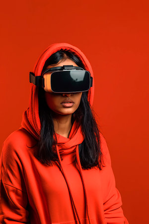 Indian Woman wearing virtual reality simulator on red background. Generative AI.