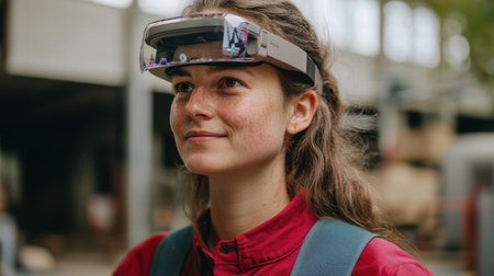 A young woman confidently wears smart glasses in an industrial setting, showcasing the integration of advanced technology in modern workspaces and research environments.