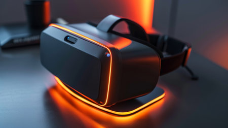 A sleek virtual reality headset is placed on a dark, textured surface, showing its modern design. Soft light reflects off the device, hinting at advanced technology for gaming and exploration.