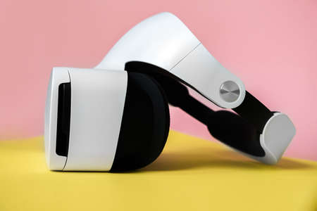 Virtual reality headset on pink blue pastel background. top view. Fly lay. minimalism