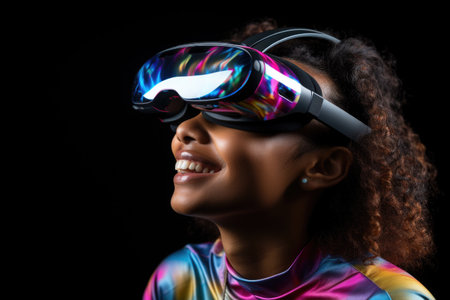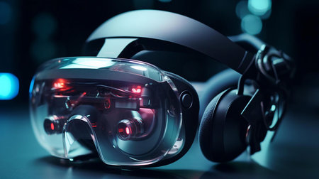 Futuristic headset with protective eyewear for virtual reality simulation generated by artificial intelligence