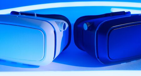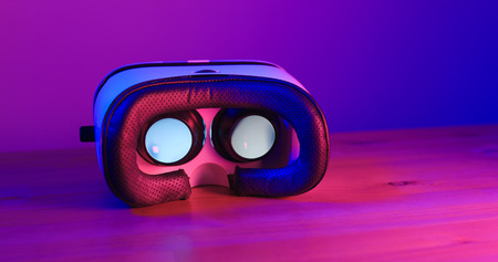 Virtual reality goggles on desk with laptop. business. 3d technology