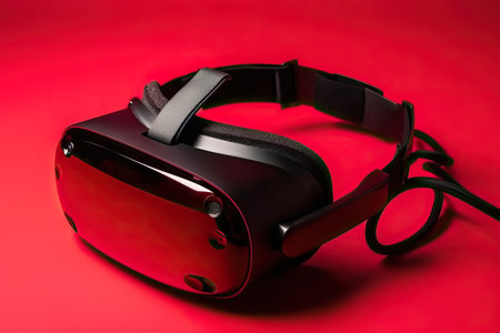 Virtual reality glasses on red background, virtual reality headset, generative AI.