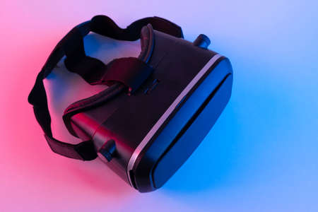 Man wearing vr glasses with copy space on neon background. Technology concept of virtual data