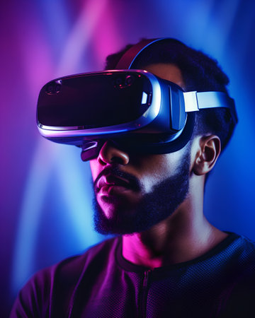 Futuristic person wearing a VR headset, immersed in virtual reality with neon lighting, subtle grain, soft focus edges, vivid background