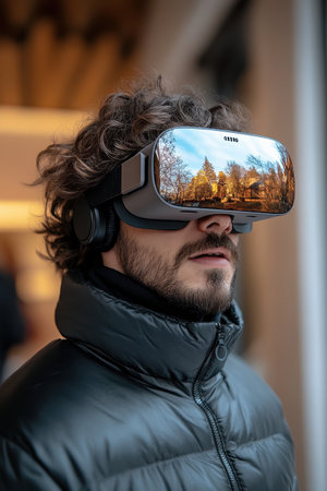 Immersed in a virtual world, a young man explores a vibrant cityscape using a vr headset, experiencing the future of technology