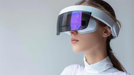 Young woman wearing virtual reality goggles. Future technology and entertainment concept.