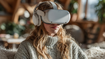 A young woman immerses herself in a virtual reality experience while wearing a sleek headset, enjoying a moment of leisure and relaxation in a cozy indoor environment.