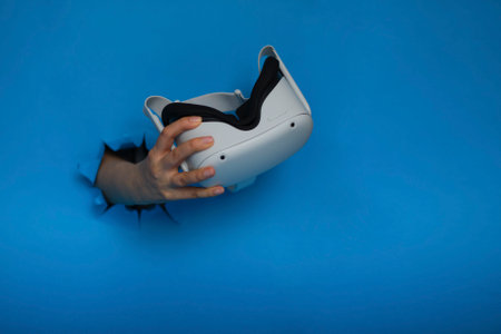 A person in a dim environment wears a glowing VR headset, immersed in a virtual experience. Blue and white lighting creates a futuristic, tech-driven mood. Perfect for gaming and simulation content.