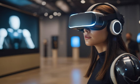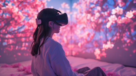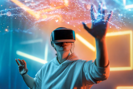 A person experiences virtual reality with vibrant colors and dynamic lights in a modern setting.