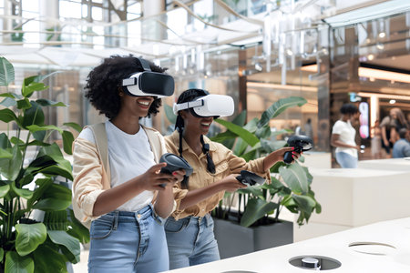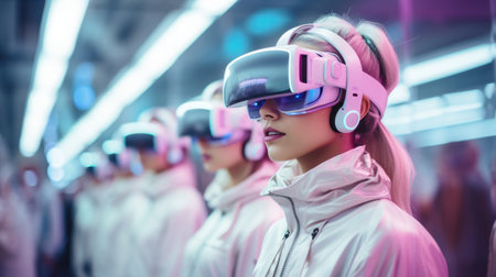Diverse group wearing VR headsets engaged in virtual collaboration in a neon-lit environment. Great for metaverse, tech, and remote work themes.