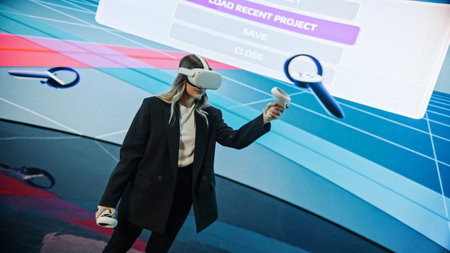 Digital Artist Using Virtual Reality 3D Software to Create a Beautiful Piece of Art in Interactive Creative Environment. Female Designer Using Virtual Reality Headset and Controllers for NFT Project.