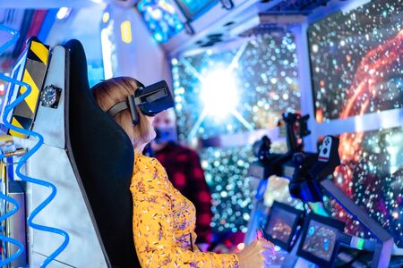 Female child using new technologies, having fun wearing virtual reality goggles in the VR room of natural history museum.