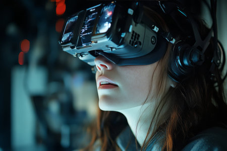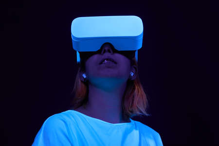 Ready for the game. The young woman in anticipation puts on virtual reality glasses, gets ready for the game, touches the air against a dark futuristic background. Copyspace.