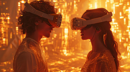 Man and woman with virtual reality headset are playing game. Image with hologram effect.