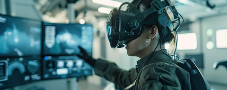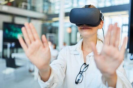 Female doctor learns medicine in simulation with a virtual reality glasses