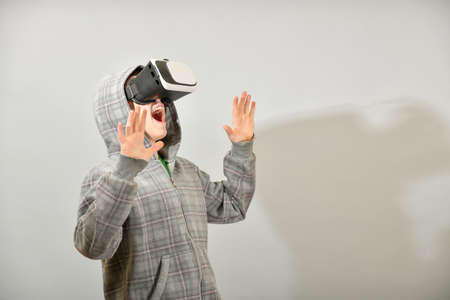 A teenager in a VR helmet is surprised by the immeasurable reality in the virtual world.