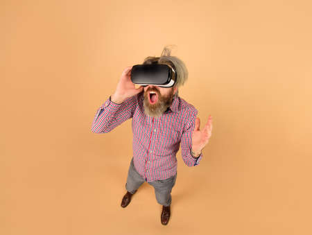 Virtual reality glasses. Scared man in virtual reality headset. 3d goggles. VR. Future technology concept. Men using VR headset. Virtual reality device. Technology