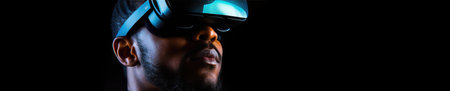 Black man fully immersed in VR, headset on, engaging with a digital world. AI generative.