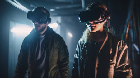 Portrait of young man and woman using virtual reality headset at night.generative ai