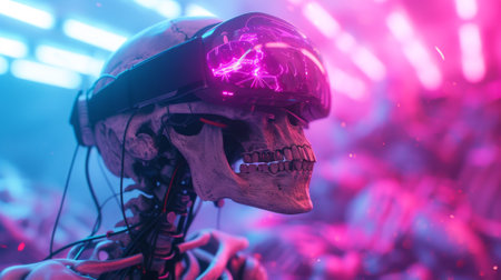 The guy is sitting in virtual reality. Neon retro style. The photo shows the effect of grain, noise.