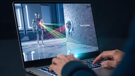 A close-up of a person interacting with a laptop displaying a futuristic robot