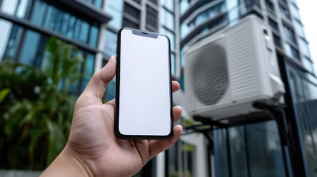 A hand is holding a smartphone displaying a blank screen. The setting includes lush green plants and an air conditioning unit, creating a modern indoor atmosphere.