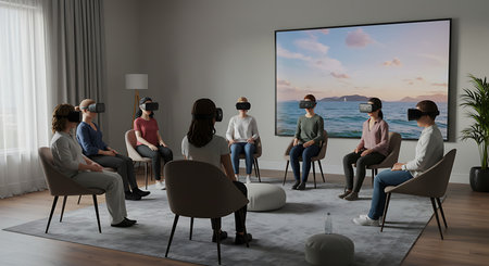 A group of people sit in a circle, wearing VR headsets, focused on a large screen displaying a tranquil ocean scene.