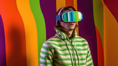Young male model wearing VR posing with trendy man fashion outfit and colorful red optical art abstract background. Picturesque generative AI