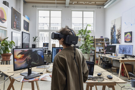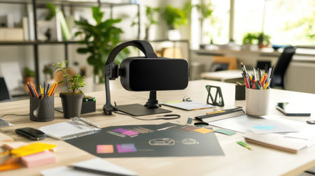 A modern workspace featuring a virtual reality headset on a desk filled with design tools, stationery, and greenery, creating an inspiring and productive atmosphere.
