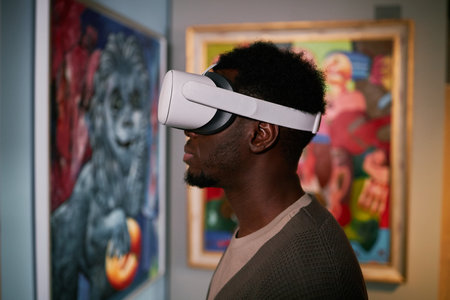 Young Black man wearing virtual reality headset while standing in art gallery with abstract paintings on walls around revealing immersive digital experience