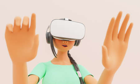 frontal shot of a girl with VR glasses impressed with her hands in front out of focus. futuristic technology and gaming concept. 3d render stylized character