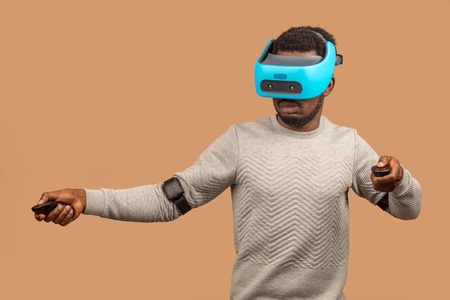 Studio shot of African american man using virtual reality headset, operating with joystick in hands, moving over beige background