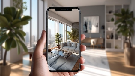 A person holds a smartphone displaying a virtual tour of a contemporary living room with elegant furnishings. Natural light fills the space, highlighting the design elements and cozy atmosphere.