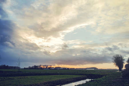 typical dutch farmland with canals at sunrise, Groningen, Netherlands