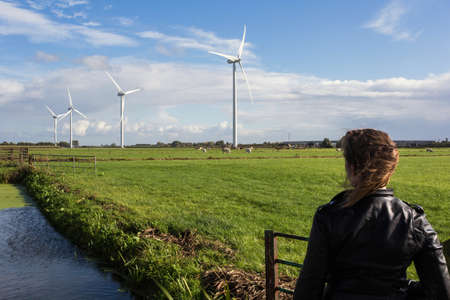 Woman looking at dutch landscape, windmills and cows in the distance with blue sky ,meadow