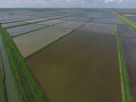 Flooded rice paddies. Agronomic methods of growing rice in the fields. Flooding the fields with water in which rice sown. View from above.