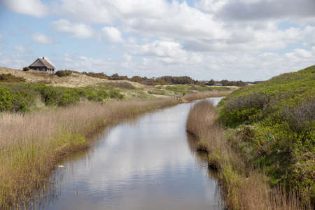 Petten aan Zee, Noord-Holland, Netherlands. April 16, 2021. Safe haven for birds during migration, swamps and puddles at the foot of the Hondsbossche Zeewering, a sign pole with the name of the lagoon