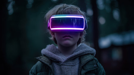Child wearing futuristic virtual reality goggles stands dimly lit forest, surrounded by trees. goggles emit vibrant glow, creating captivating contrast against dark background. scene evokes sense