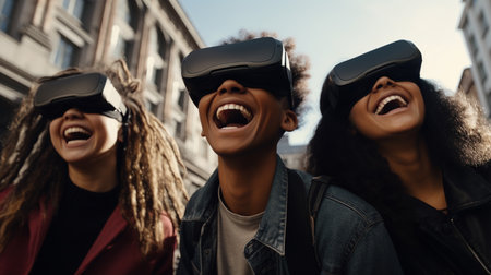 People wearing virtual reality headset. VR goggles innovation technology. Generative AI