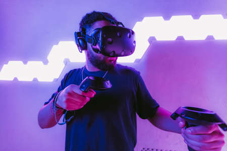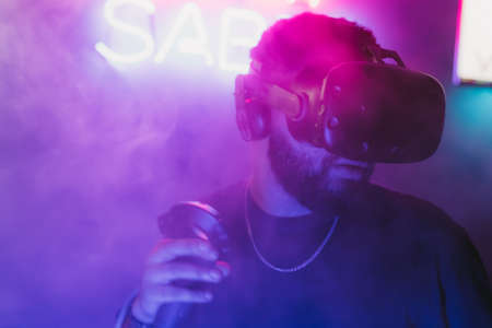 Man using virtual reality headset in dark room of vr gaming club. Concept of virtual simulation, gaming, internet of things.