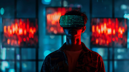 Caucasian bearded man with VR headset surrounded by colorful abstract lights. Concept of virtual reality, technology, digital experience, futuristic innovation.
