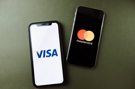 MasterCard and visa logo on the smartphone screen. High quality photo