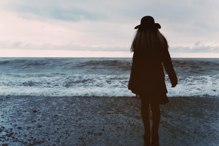 young woman in a black coat on the beach