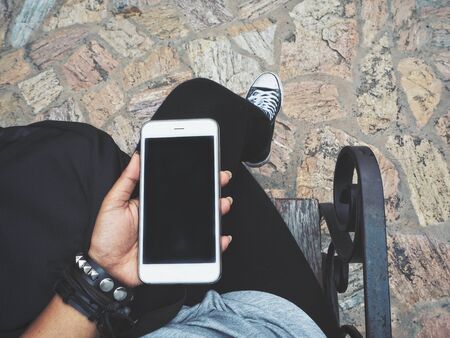 The young man is holding a mobile phone, taking pictures of the scenery at Pha Nok Aen. Phu Kradueng National Park, Loei Province