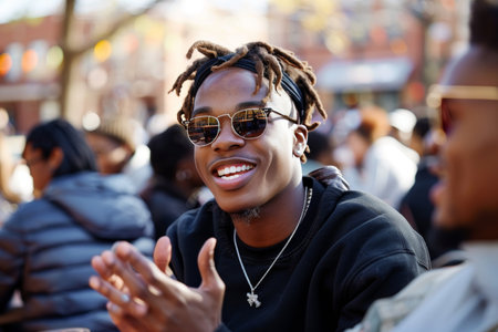Handsome Man with Dreadlocks Wearing Sunglasses and Clapping During a Social Gathering with Friends