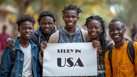 Group of five happy African students holding a 'Study in USA' sign on a university campus, representing international education.