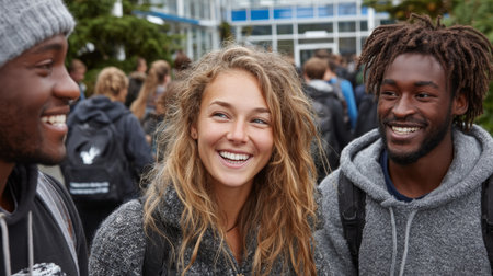 Three friends enjoying conversation on campus with a supportive and cheerful atmosphere